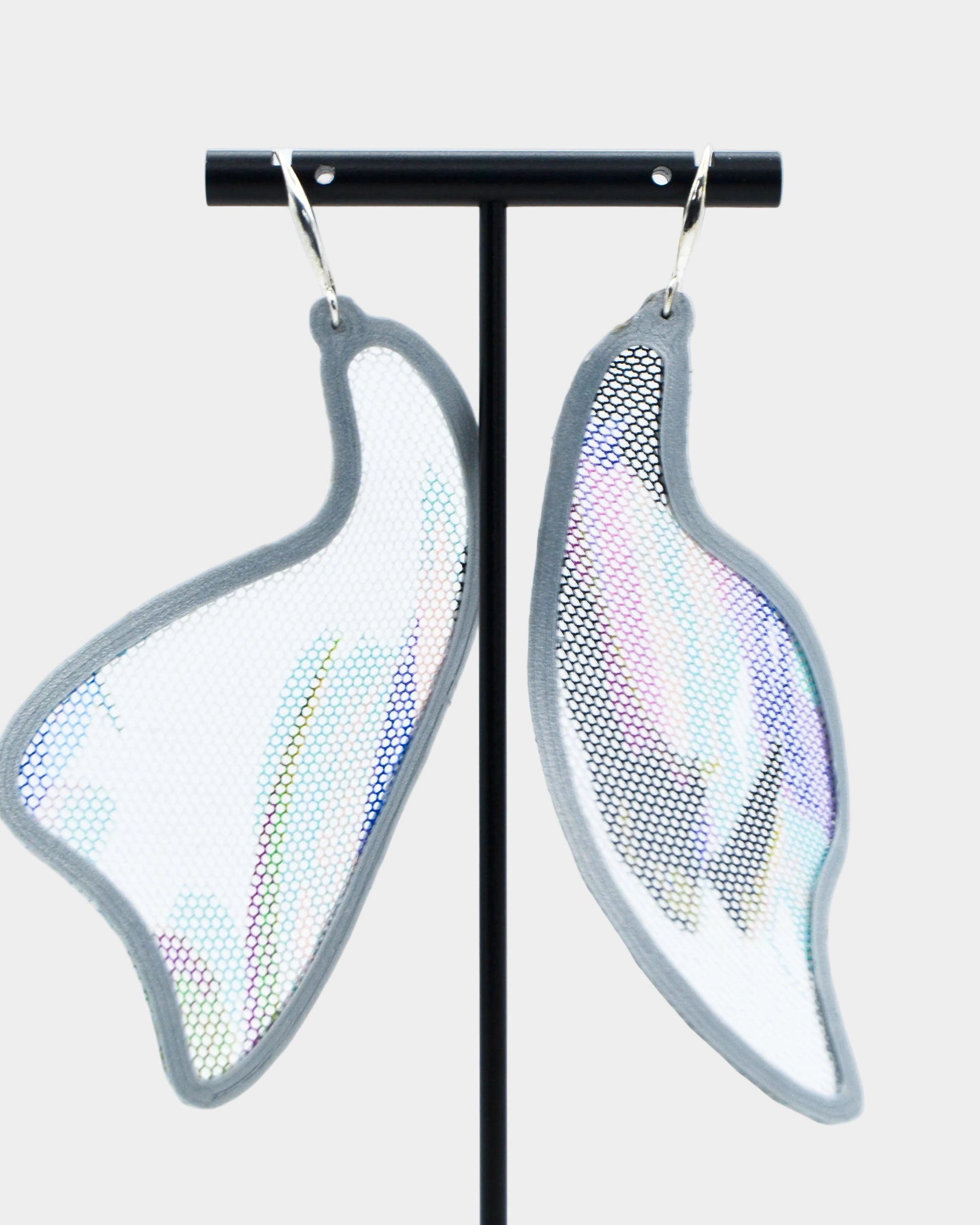 Sculptural earrings, 3D-printed directly onto soft tulle, feather-light, flexible, and designed to move with you.