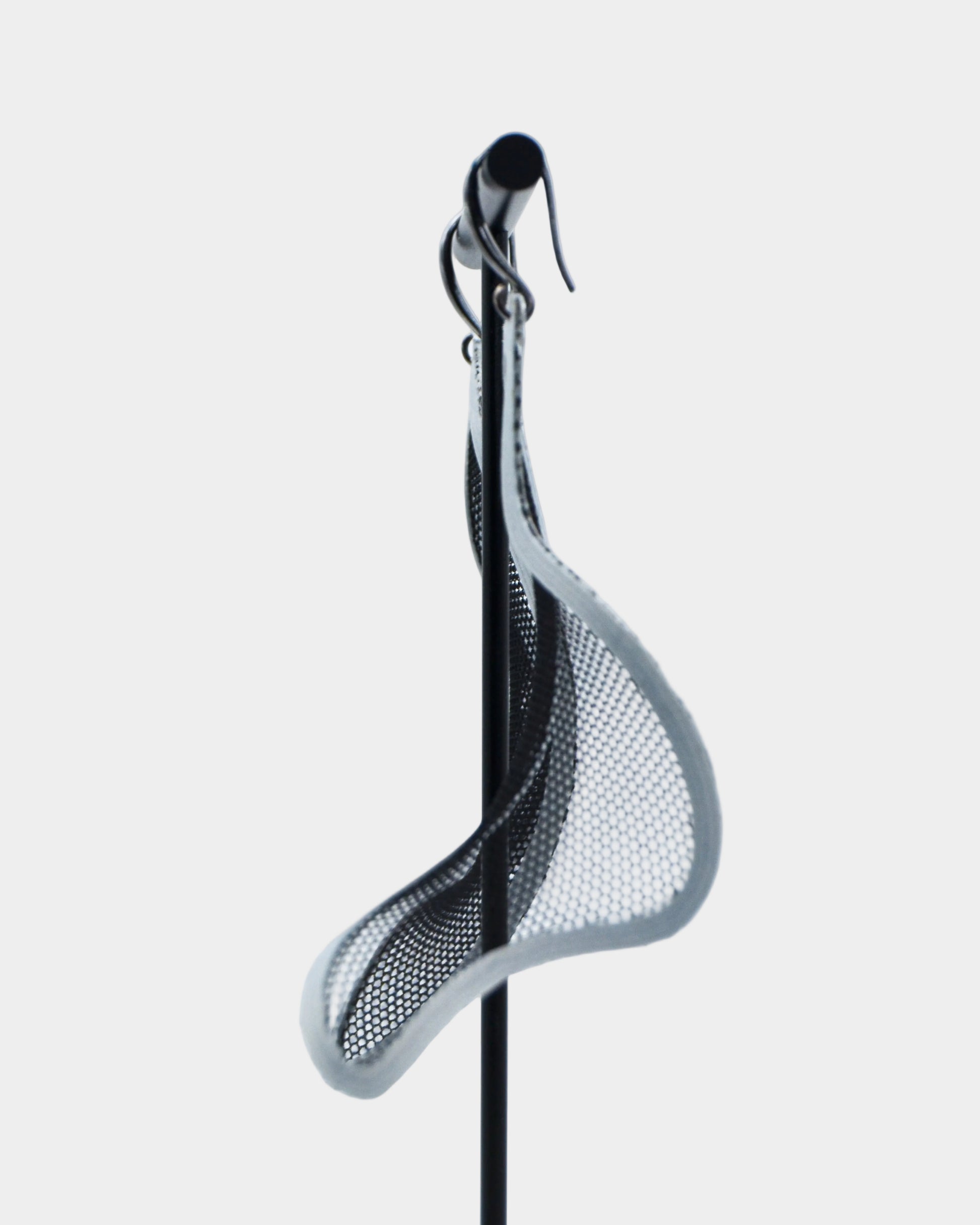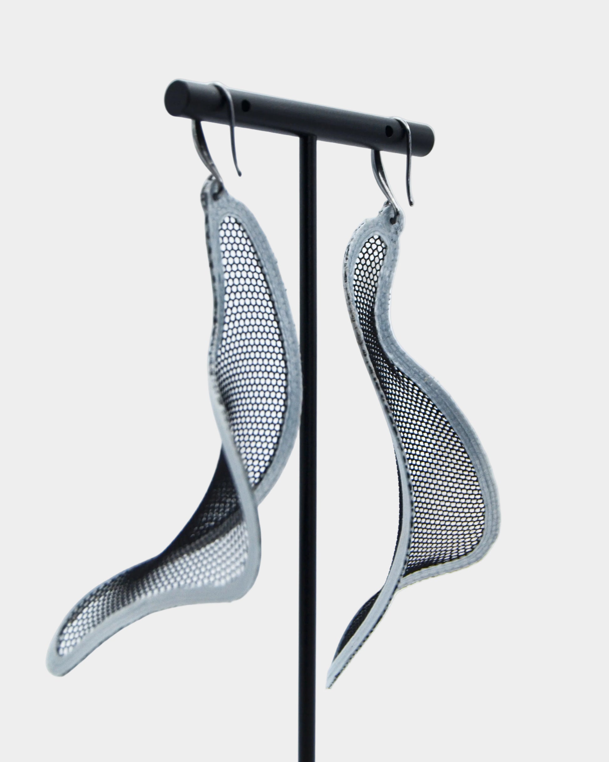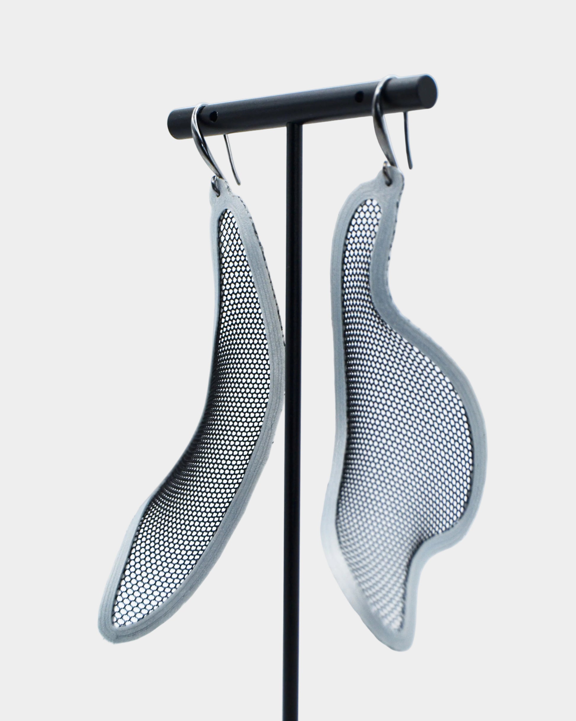 Sculptural earrings, 3D-printed directly onto soft tulle, feather-light, flexible, and designed to move with you.