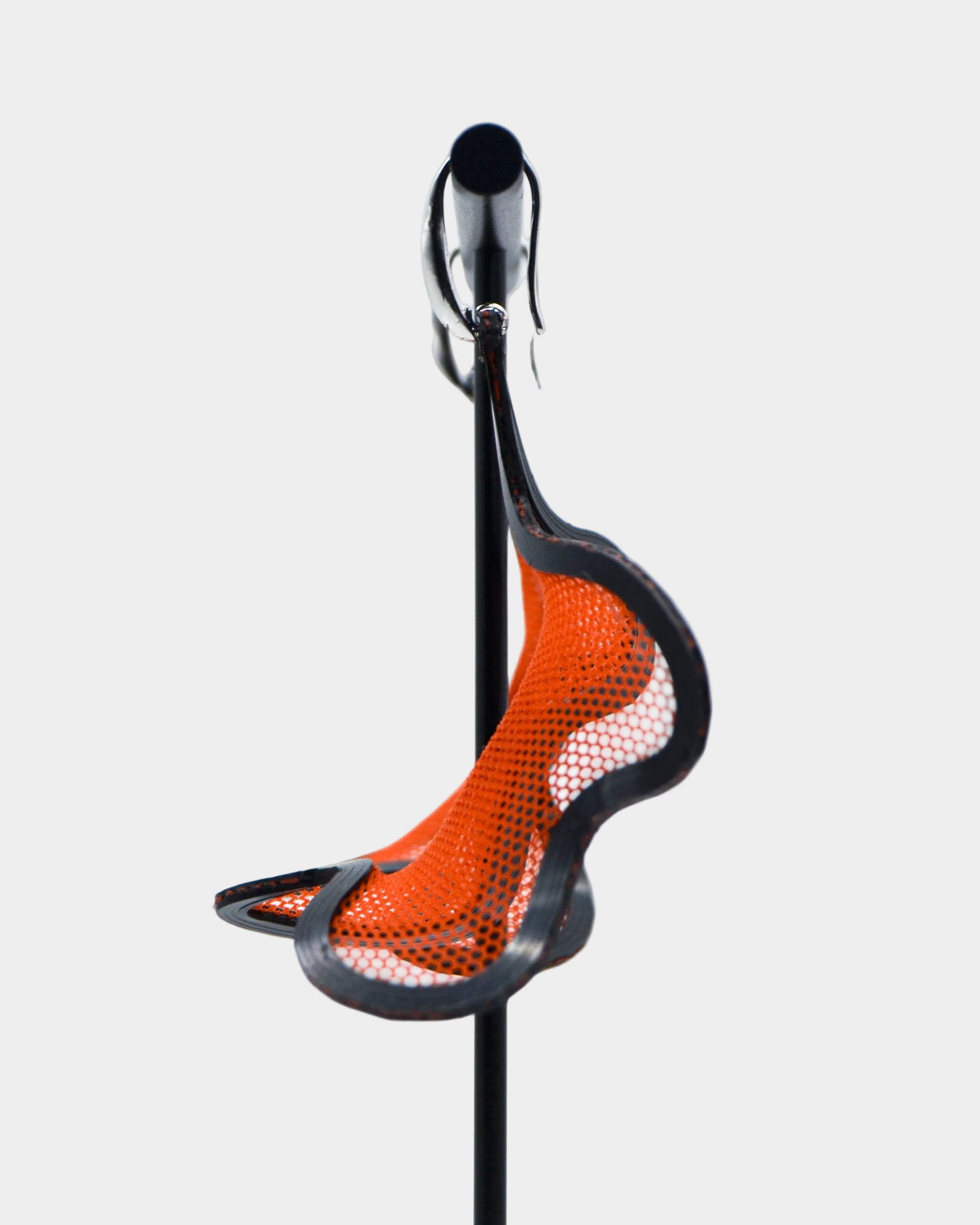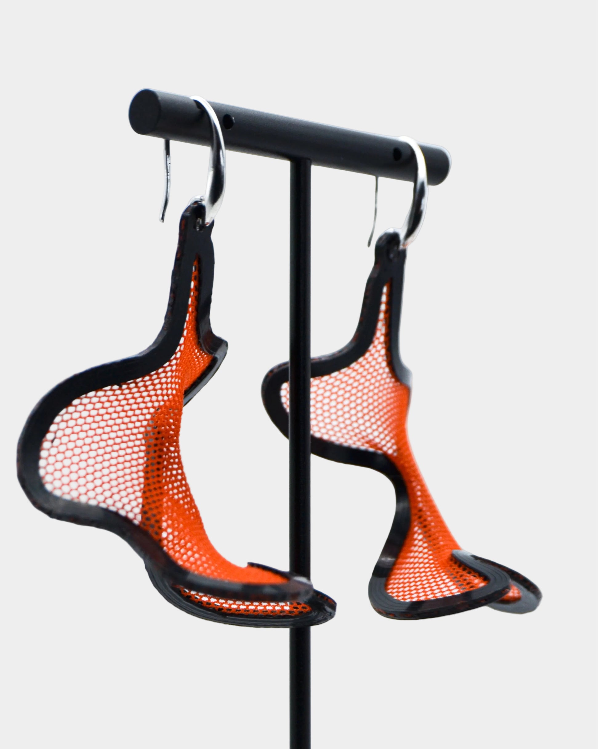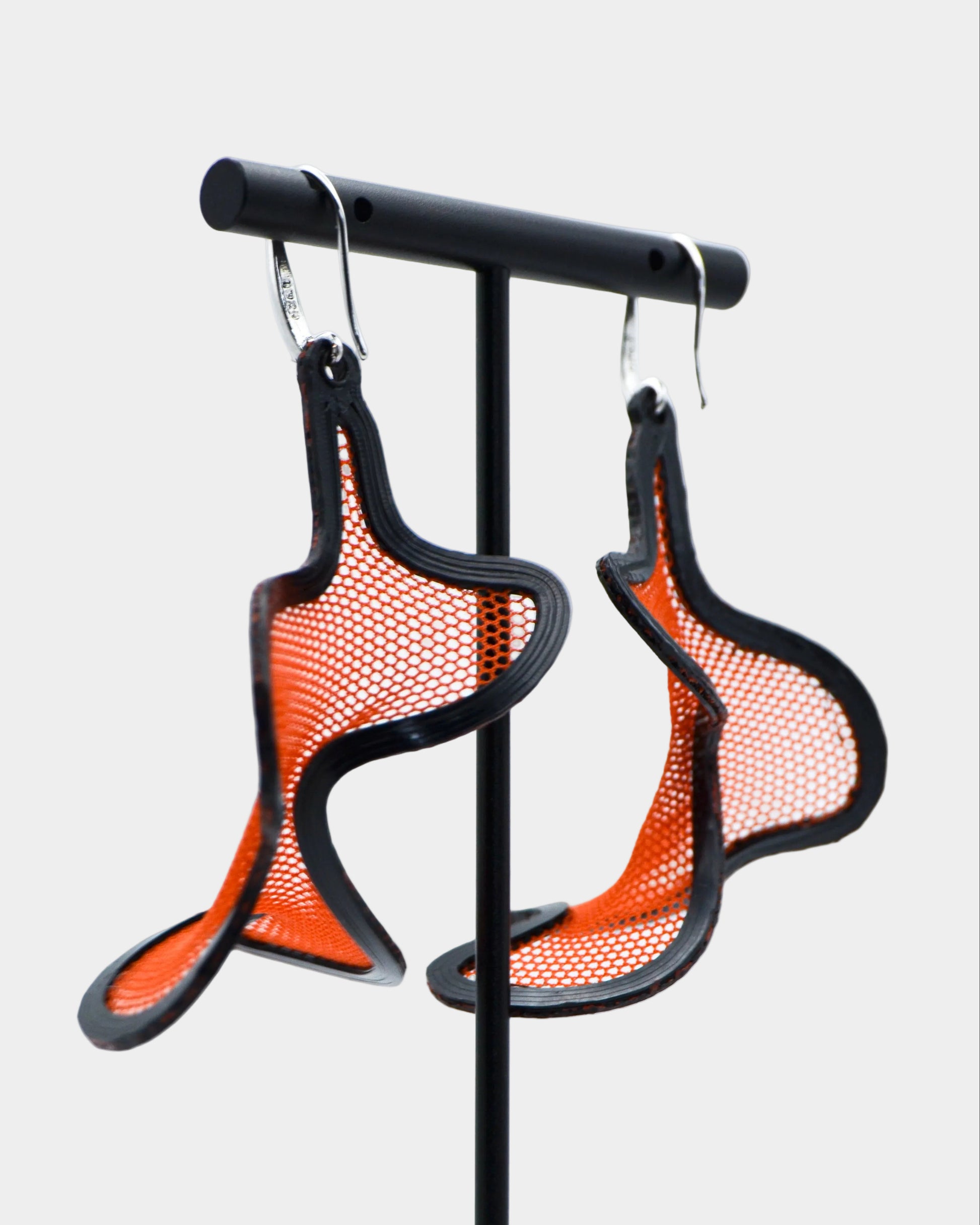 Sculptural earrings, 3D-printed directly onto soft tulle, feather-light, flexible, and designed to move with you.